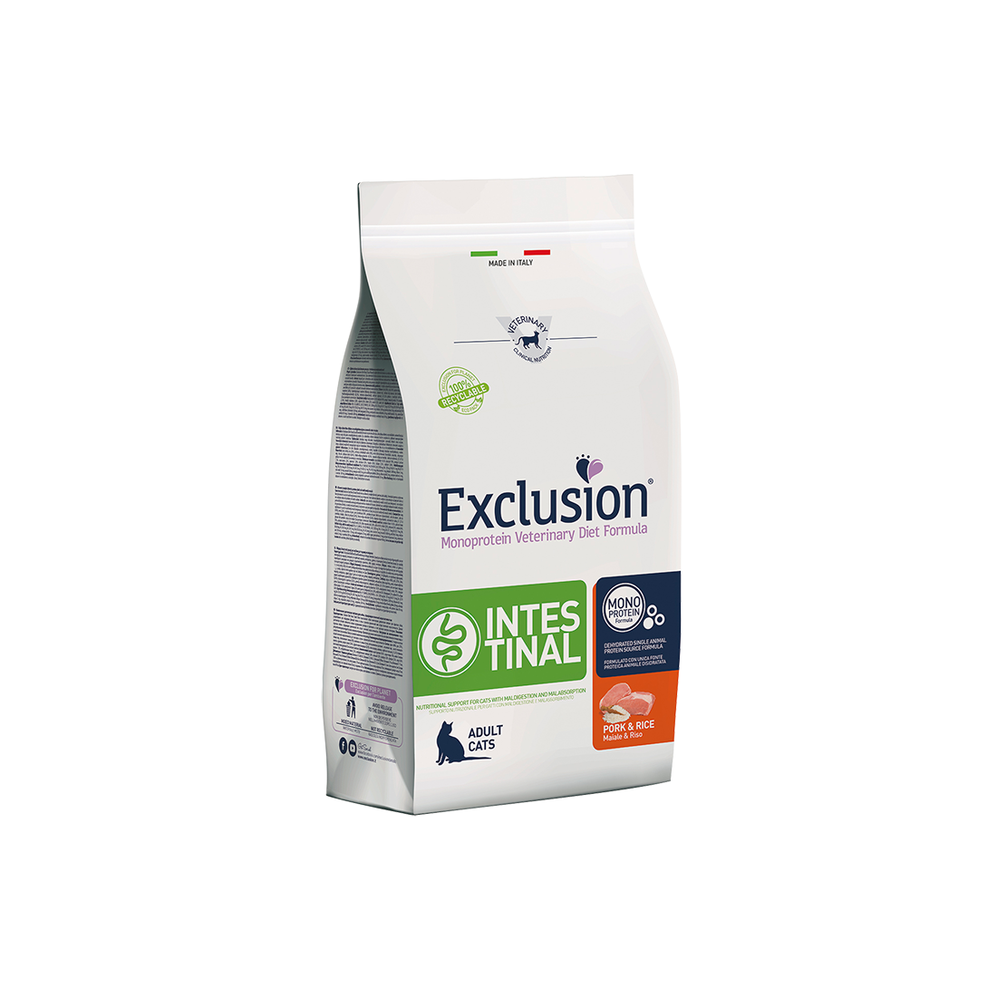 Exclusion Monoprotein Veterinary Diet Formula Intestinal è un alimento dietetico con formulazione monoproteica, realizzato con un’unica fonte alternativa di proteine animali, ingredienti innovativi e preservato con tocoferoli naturali; rappresenta la risposta nutrizionale a disposizione del Veterinario, come supporto nutrizionale specifico per gatti con maldigestione e malassorbimento.