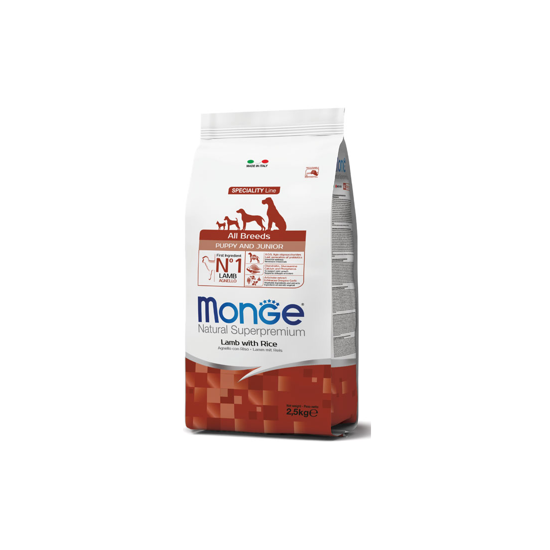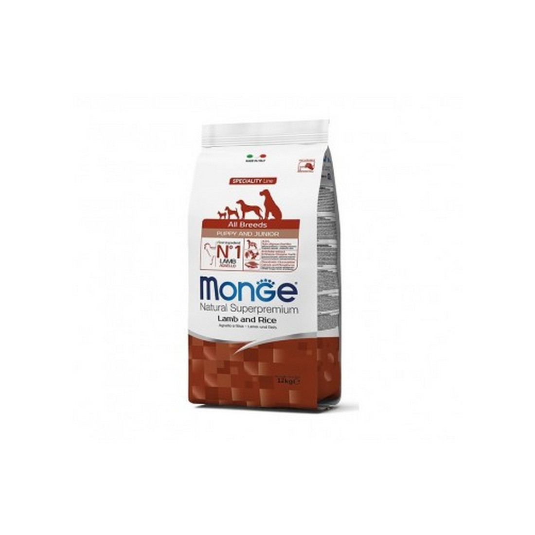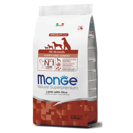 Monge Natural Superpremium All breeds Puppy and Junior Agnello con Riso è un alimento completo per cani cuccioli di tutte le taglie.
