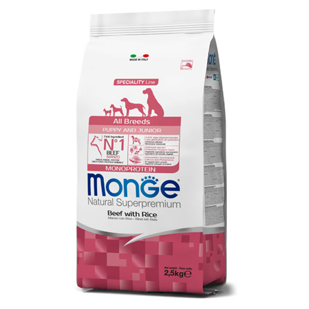Monge Natural Superpremium All breeds Puppy and Junior Monoprotein Manzo con riso è un alimento completo per cani cuccioli di tutte le taglie. Specificamente sviluppato pensando al benessere del tuo cane, grazie alla presenza di sostanze nutritive di qualità frutto della ricerca Made in Italy.