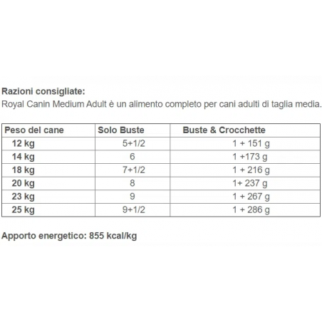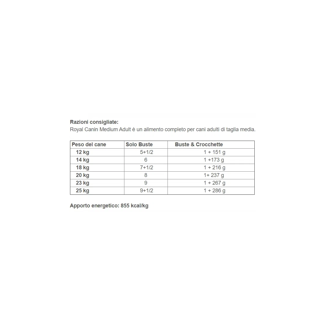 Royal Canin Busta Adult Medium è un alimento umido completo per cani adulti. Si compone di deliziosi bocconcini in salsa, Omega 3, EPA e DHA per il benessere della cute. La ricetta è stata specificatamente studiata per soddisfare le esigenze dei cani adulti di taglia media con peso da 11 a 25 kg e dai 12 mesi ai 10 anni di età. Grazie a Royal Canin Busta Adult Medium avrai a disposizione un alimento succulento con il quale poter viziare il vostro amico a quattro zampe e al tempo fornire al suo organismo l'apporto energetico ideale.
