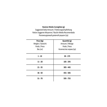 Energia Metabolizzabile: 3498 kcal/kg – 14.6 MJ/kg.