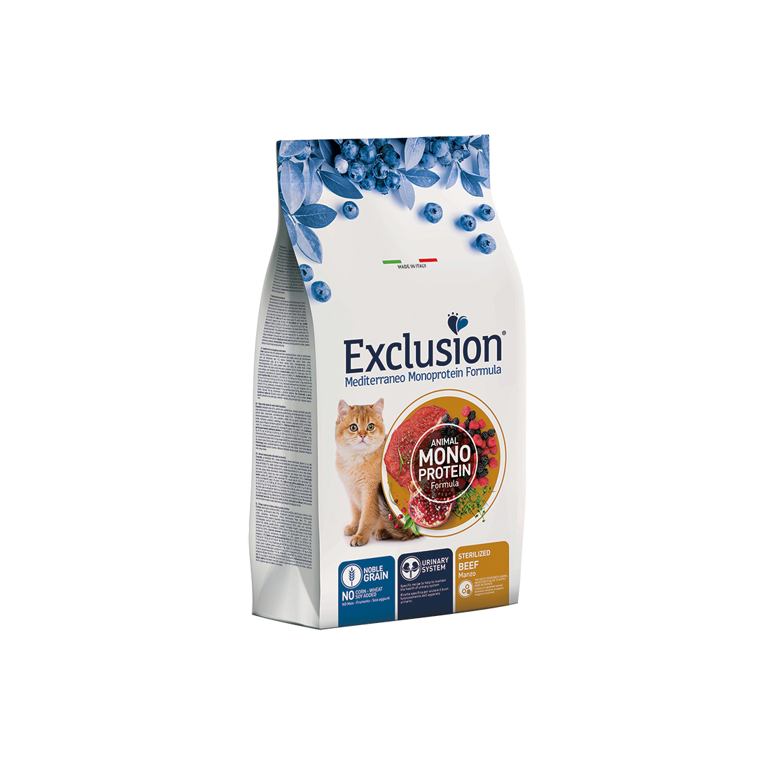 Exclusion Mediterraneo Monoprotein Formula – Noble Grain é un alimento completo e bilanciato, formulato con una sola fonte proteica animale disidratata, per una ricetta chiara ed essenziale, e con solo un cereale nobile di alta qualità. La specifica formulazione aiuta il buon funzionamento delle vie urinarie ed è preservato con antiossidanti naturali. È realizzato con una innovativa ricetta con Superfood della tradizione Mediterranea: melagrana, more, lamponi e mirtilli neri. È arricchito con Psyllium per aiutare a contrastare la formazione dei boli di pelo. Senza grasso di pollo, frumento, soia e mais aggiunti.