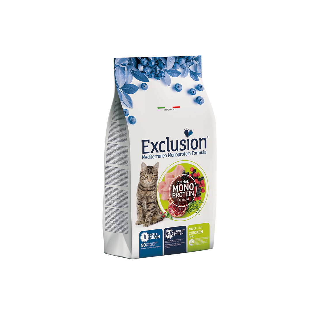 Exclusion Mediterraneo Monoprotein Formula – Noble Grain é un alimento completo e bilanciato, formulato con una sola fonte proteica animale disidratata, per una ricetta chiara ed essenziale, e con solo un cereale nobile di alta qualità. La specifica formulazione aiuta il buon funzionamento delle vie urinarie ed è preservato con antiossidanti naturali. È realizzato con una innovativa ricetta con Superfood della tradizione Mediterranea: melagrana, more, lamponi e mirtilli neri. È arricchito con Psyllium per aiutare a contrastare la formazione dei boli di pelo. Senza grasso di pollo, frumento, soia e mais aggiunti.