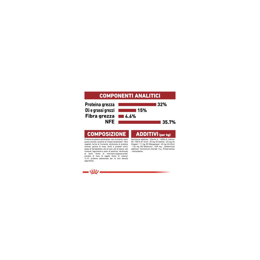 proteina del pollame (disidratata), riso, mais, grasso animale, farinetta di mais, cellulosa lignea, proteine animali (idrolizzate), isolato di proteine vegetali*, frumento, polpa di barbabietola disidratata, lievito, minerali, olio di soia, olio di pesce, idrolizzato di lieviti (fonte di mannano-oligosaccaridi), farina di fiori di tagete (fonte di luteina).