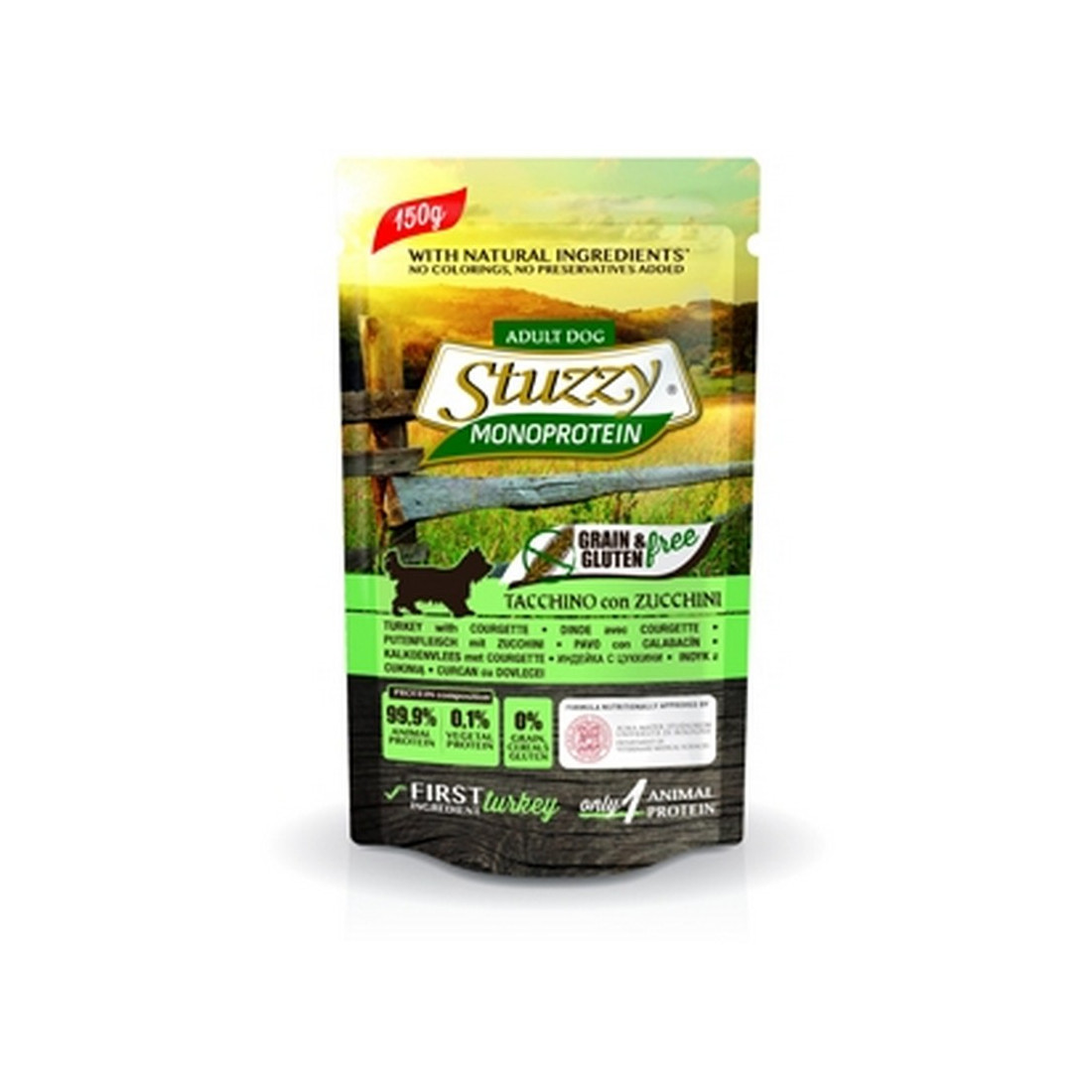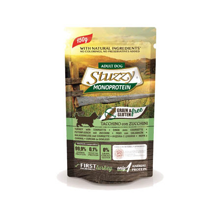 Stuzzy Monoproteico Buste 150gr è un alimento completo per cani adulti. Formulato senza aggiunta di cereali né glutine, con un’unica fonte di proteine animali, che costituiscono il 100% della quota proteica. L’ingrediente di origine animale è sempre il primo della composizione (pollo, manzo, vitello e maiale/prosciutto sono freschi in origine;); senza coloranti o conservanti aggiunti.