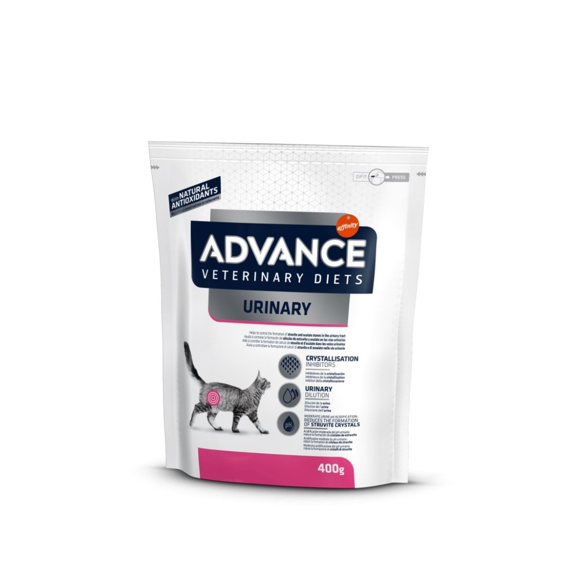 ADVANCE VETERINARY DIETS URINARY è un alimento dietetico completo per gatti adulti. Grazie a un livello moderato di magnesio e a proprietà acidificanti dell’orina, è indicato per contenere il rischio di recidiva dei calcoli di struvite nell'orina. È inoltre una dieta completa ed equilibrata, ideale per l'alimentazione quotidiana dei gatti con tendenza a soffrire di problemi urinari.