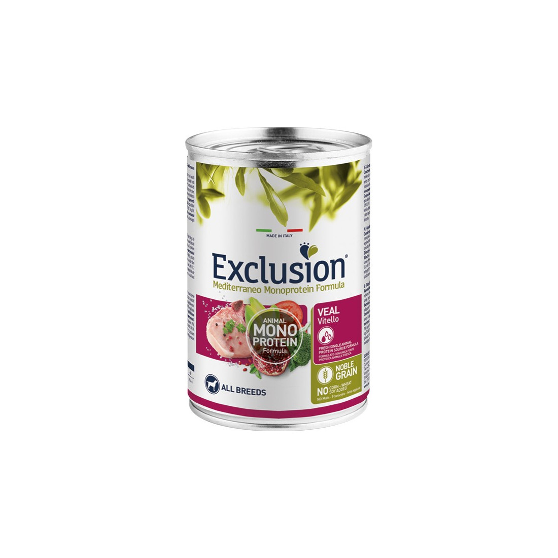Exclusion Mediterraneo Monoprotein Formula – Noble Grain é un alimento completo e bilanciato formulato con una sola fonte proteica animale disidratata, per una ricetta chiara ed essenziale, e solo un cereale nobile di alta qualità. È preservato con antiossidanti naturali e integrato con Beta-glucani. È realizzato con una innovativa ricetta di Superfood della tradizione Mediterranea: Canapa, Olio d’Oliva, Pomodoro, Melagrana, Broccolo e Cicoria. Senza grasso di pollo, frumento, soia e mais aggiunti.