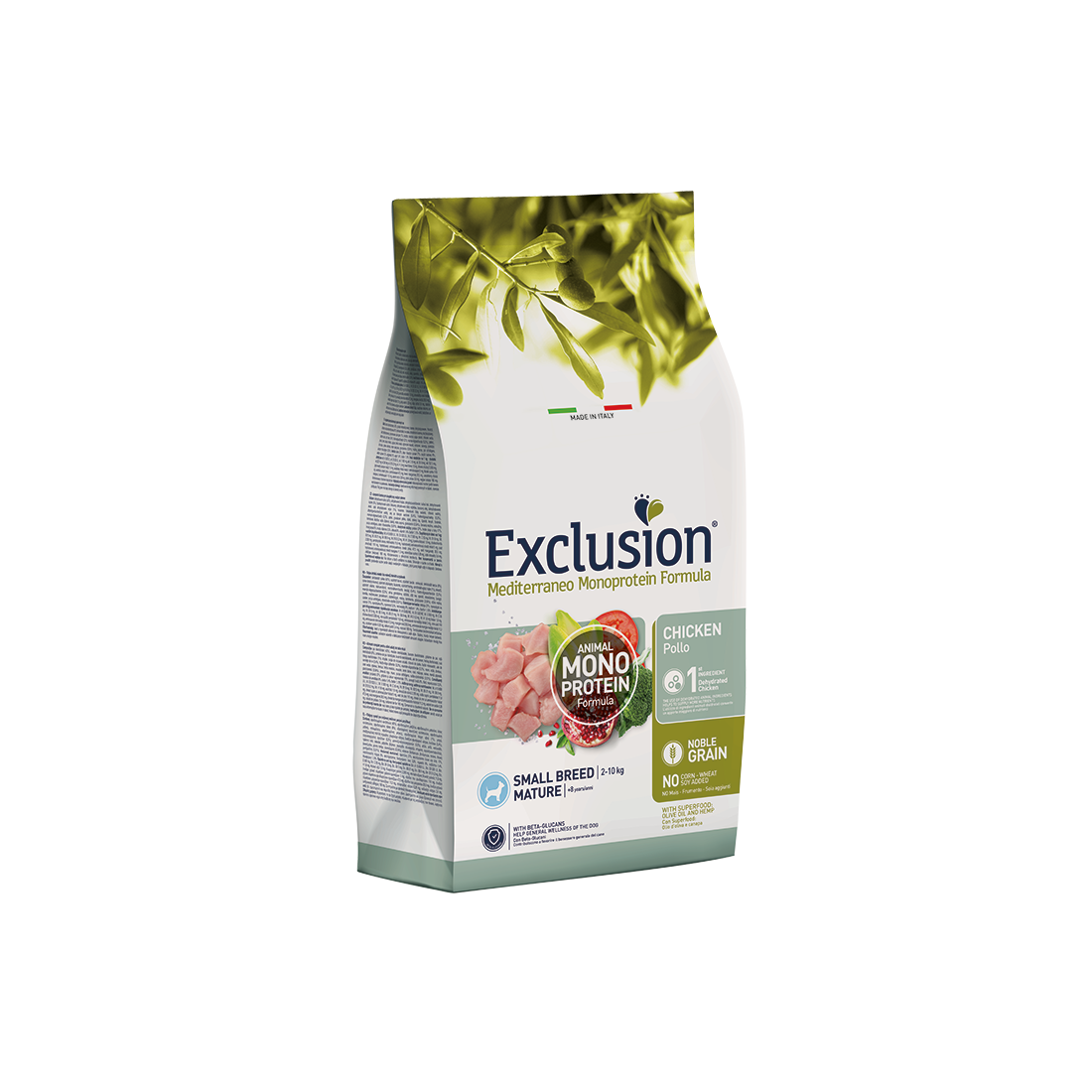 Exclusion Mediterraneo Monoprotein Formula – Noble Grain é un alimento completo e bilanciato formulato con una sola fonte proteica animale disidratata, per una ricetta chiara ed essenziale, e solo un cereale nobile di alta qualità. È preservato con antiossidanti naturali e integrato con Beta-glucani. È realizzato con una innovativa ricetta di Superfood della tradizione Mediterranea: Canapa, Olio d’Oliva, Pomodoro, Melagrana, Broccolo e Cicoria. Senza grasso di pollo, frumento, soia e mais aggiunti.