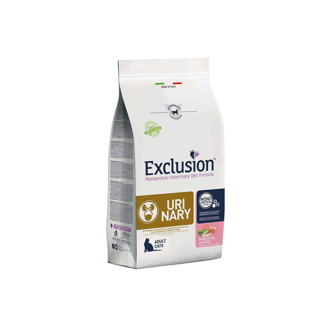 Exclusion Monoprotein Veterinary Diet Formula Urinary è un alimento dietetico con formulazione monoproteica, realizzato con un’unica fonte alternativa di proteine animali, ingredienti innovativi e preservato con tocoferoli naturali; rappresenta la risposta nutrizionale a disposizione del Veterinario, come supporto nutrizionale specifico per la dissoluzione e la riduzione di recidive dei calcoli di struvite nei gatti.