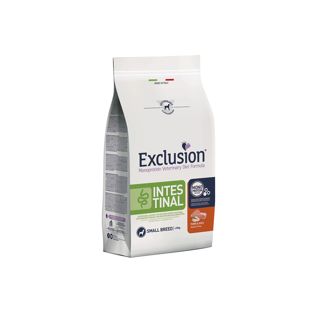 Exclusion Monoprotein Veterinary Diet Formula Intestinal è un alimento dietetico con formulazione monoproteica, realizzato con un’unica fonte alternativa di proteine animali, ingredienti innovativi e preservato con tocoferoli naturali; rappresenta la risposta nutrizionale a disposizione del Veterinario, differenziata per taglia, come supporto nutrizionale per cani con patologie gastrointestinali, maldigestione e malassorbimento.