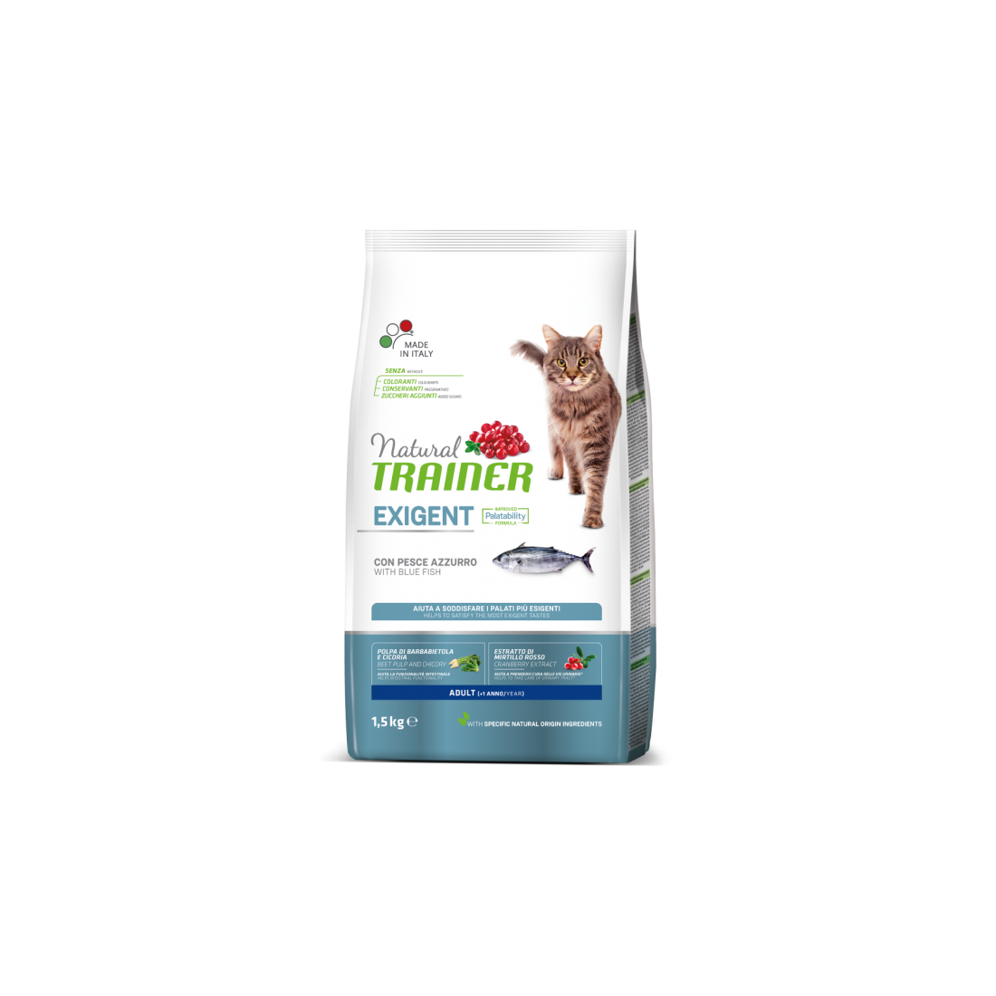 Natural Trainer Exigent Cat elaborato con pesce dell oceano ed ingredienti funzionali come la menta, la mela o l estratto di mirtilli rossi, formano un delizioso alimento ideale per farti prendere cura della salute del tuo gatto con gusti più esigenti.