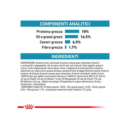 amido di mais, idrolizzato di piume a basso peso molecolare (fonte di L-aminoacidi e oligopeptidi), olio di copra, olio di soia, sali minerali, fibre vegetali, polpa di cicoria, frutto-oligosaccaridi, olio di pesce, mono e digliceridi di acidi grassi esterificati con acido citrico, grassi animali, estratto di fiore di Tagete (fonte di luteina).