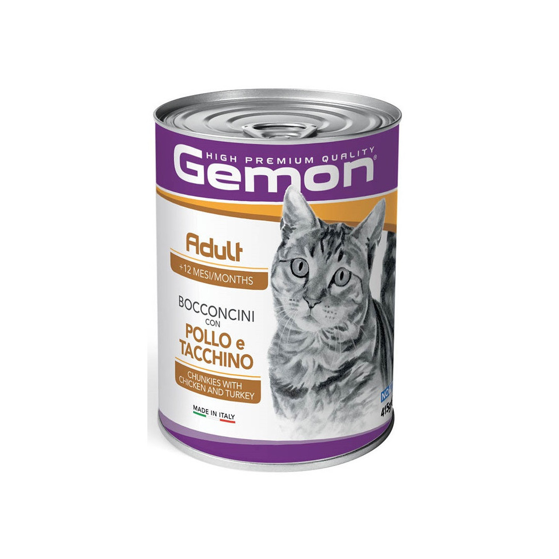 GEMON BOCCONCINI CON POLLO E TACCHINO è un alimento completo per gatti adulti, formulato per fornire tutti i nutrienti necessari per la vitalità quotidiana dei nostri amici a quattro zampe.