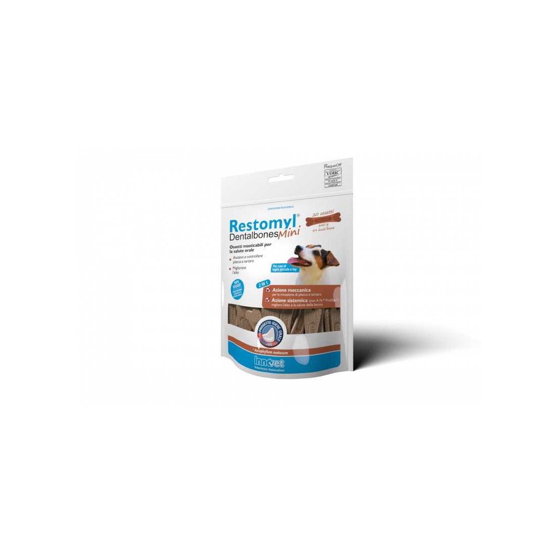 Se vuoi mantenere i denti puliti al tuo cane puoi avvalerti dell’aiuto di Restomyl® Dentalbones Mini per taglie toy e mini. La forma di questi speciali ossi consente una rimozione efficace di placca e tartaro (azione meccanica). A.N. ProDen® viene assorbito dopo somministrazione orale e, attraverso la circolazione, raggiunge le ghiandole salivari. Una volta concentrato nella saliva, impedisce la crescita sulla superficie dentaria della componente batterica della placca e previene la deposizione del tartaro. Il risultato sono denti più puliti, alito migliore e una complessiva salute del cavo orale! Restomyl® Dentalbones non contiene alcun ingrediente che maschera il cattivo odore dell’alito.
