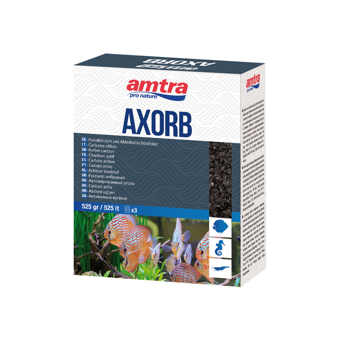 AMTRA AXORB 525 gr – carbone attivo di origine minerale – per trattare 525 Litri d’acqua dolce o marina – il materiale è all’interno di tre retine per facilitarne l’inserimento nei filtri
