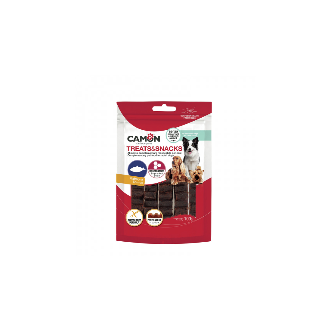 Delizioso snack porzionato a forma di barretta per cani, al salmone.