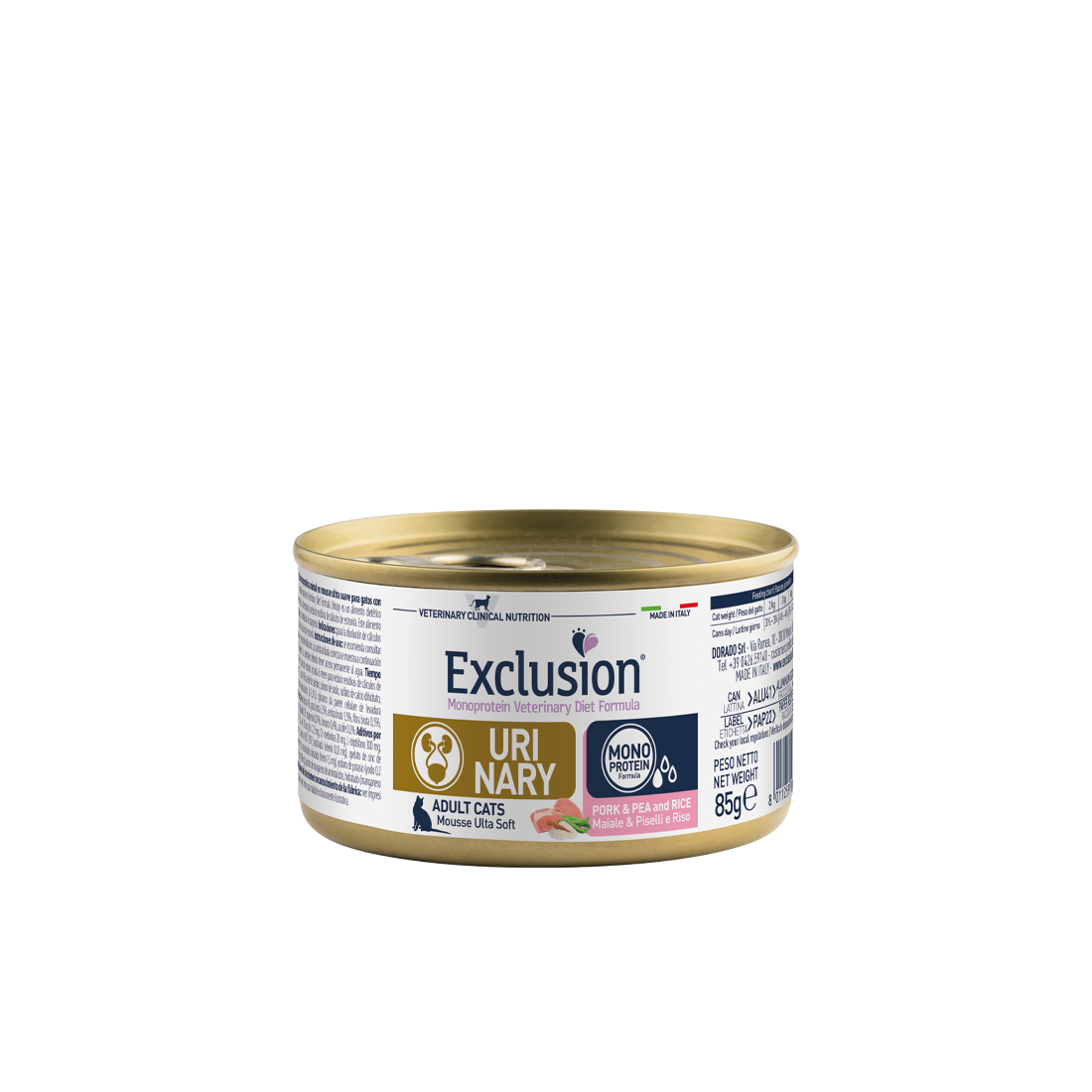 Exclusion Monoprotein Veterinary Diet Formula Urinary è un alimento dietetico con formulazione monoproteica, realizzato con un’unica fonte alternativa di proteine animali, ingredienti innovativi e preservato con tocoferoli naturali; rappresenta la risposta nutrizionale a disposizione del Veterinario, come supporto nutrizionale specifico per la dissoluzione e la riduzione di recidive dei calcoli di struvite nei gatti.