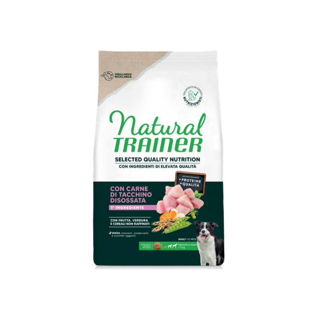 Fai felice il tuo cane con un’alimentazione che rispetta natura e benessere: scegli Natural Trainer Selected Quality Cane Medium Maxi con Tacchino e guarda il tuo amico correre felice e in forma ogni giorno!