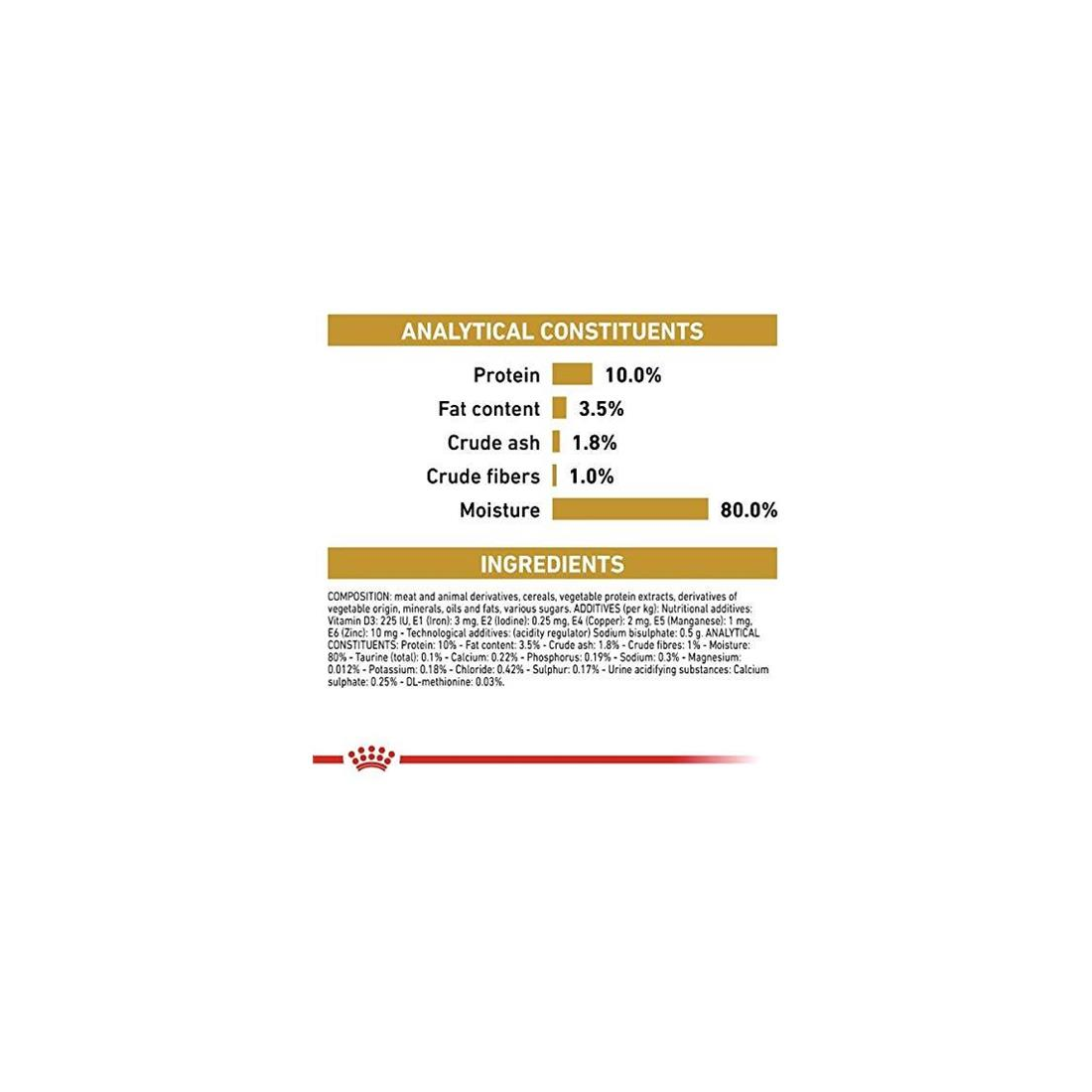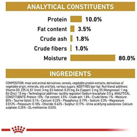 Royal canin urinary s/o chicken pollo aumenta il volume dell'urina, diminuendo così la concentrazione di cristalli, per combattere i calcoli e le infiammazioni urinarie.la sua formula specifica rinforza la pellicola protettiva che riveste le pareti della vescica, difendendola da batteri e tossine.composizione royal canin urinary s/o chicken pollo:carne e sottoprodotti di origine animale (di cui 5% pollo), cereali, oli e grassi, uova e derivati, sottoprodotti di origine vegetale, minerali, molluschi e crostacei, zuccheri.additivi royal canin urinary s/o chicken pollo:additivi fisiologico-nutrizionali: vitamina d3 (280 ui/kg), ferro (5,6 mg/kg), iodio (0,2 mg/kg), rame (0,3 mg/kg), manganese (1,7 mg/kg), zinco (17 mg/kg).