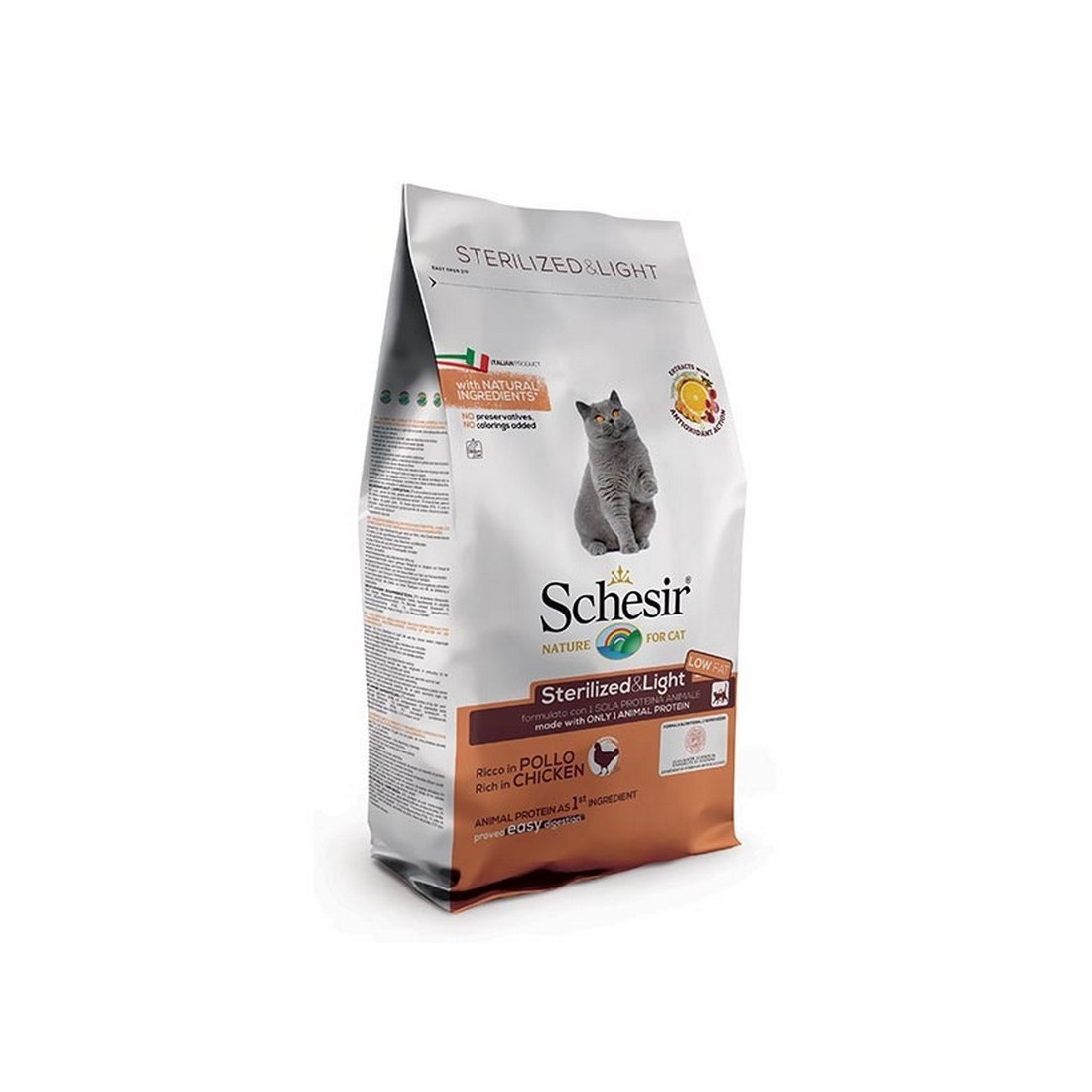 Una ricetta Schesir che ha come primo ingrediente il pollo, che costituisce l’unica fonte proteica animale del prodotto: un gustoso alimento completo e bilanciato, facilmente digeribile, che soddisfa le esigenze nutrizionali dei gatti adulti sterilizzati di tutte le razze. Il basso contenuto di grassi e l’elevato contenuto in fibre, rispetto al prodotto di mantenimento, contribuiscono a mantenere il giusto peso del gatto.
