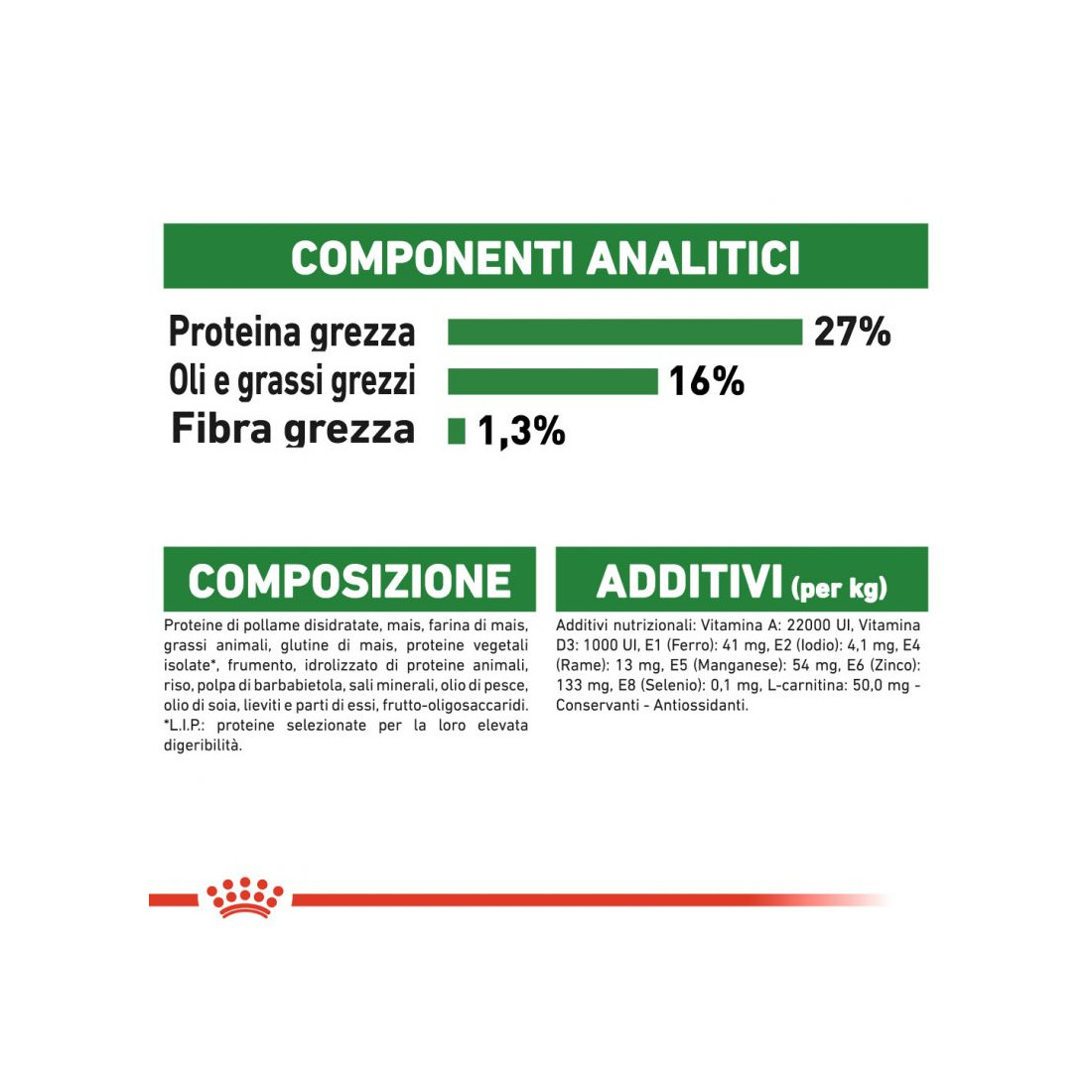 Mais, farina di mais, carne di pollame disidratata, grassi animali, carne di manzo disidratato e proteine * carne di maiale, proteine animali idrolizzate, glutine di mais, isolato di proteine vegetali, polpa di barbabietola, lieviti, olio di soia, olio di pesce, minerali, frutto-oligosaccaridi.