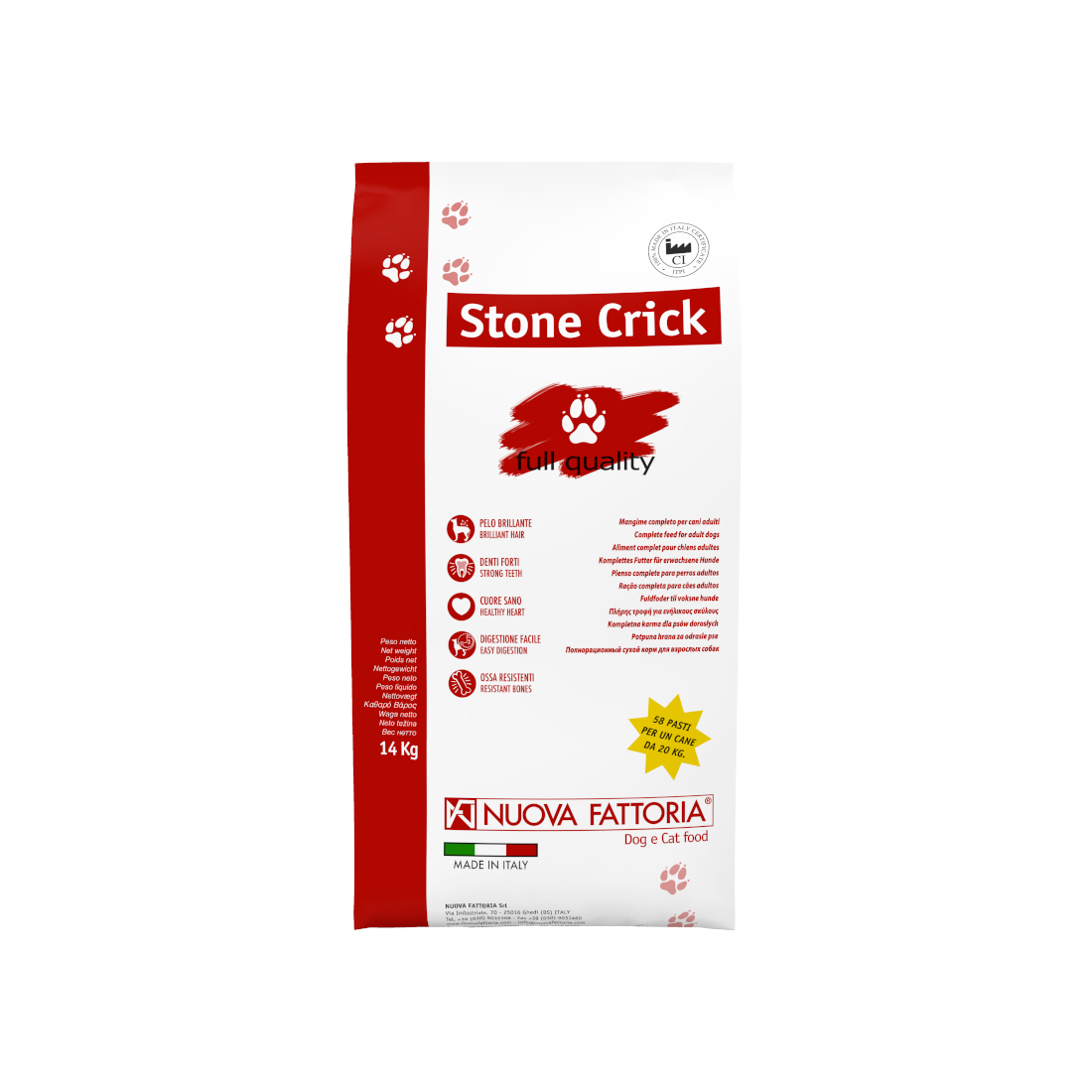 Trovate le crocchette della linea Stone Crick di Nuova Fattoria nei formati da 4 Kg. – 14 Kg. – 19 Kg..