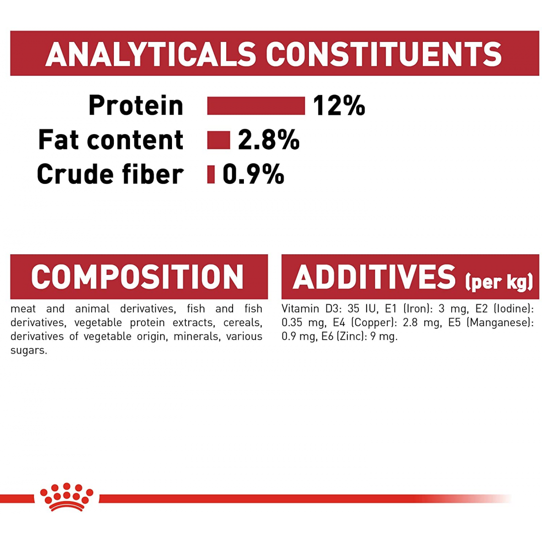 ComponentiElementi analitici Proteina 9,4%, contenuto di grassi 4%, fibra grezza 0,6%, cenere grezza 1,7% Composizione Carne e sottoprodotti di origine animale, cereali, estratti proteici vegetali, sottoprodotti di origine vegetale, minerali, zucchero. Contenuto di umidità 80,50% Additivi per kg Additivi nutrizionali: Vitamina D3: 200 UI, E1 (ferro): 3,6 mg, E2 (iodio): 0,35 mg, E4 (rame): 2,8 mg, E5 (manganese): 1 mg, E6 (zinco): 11 mg