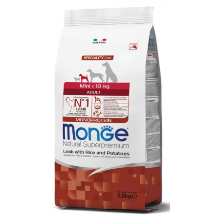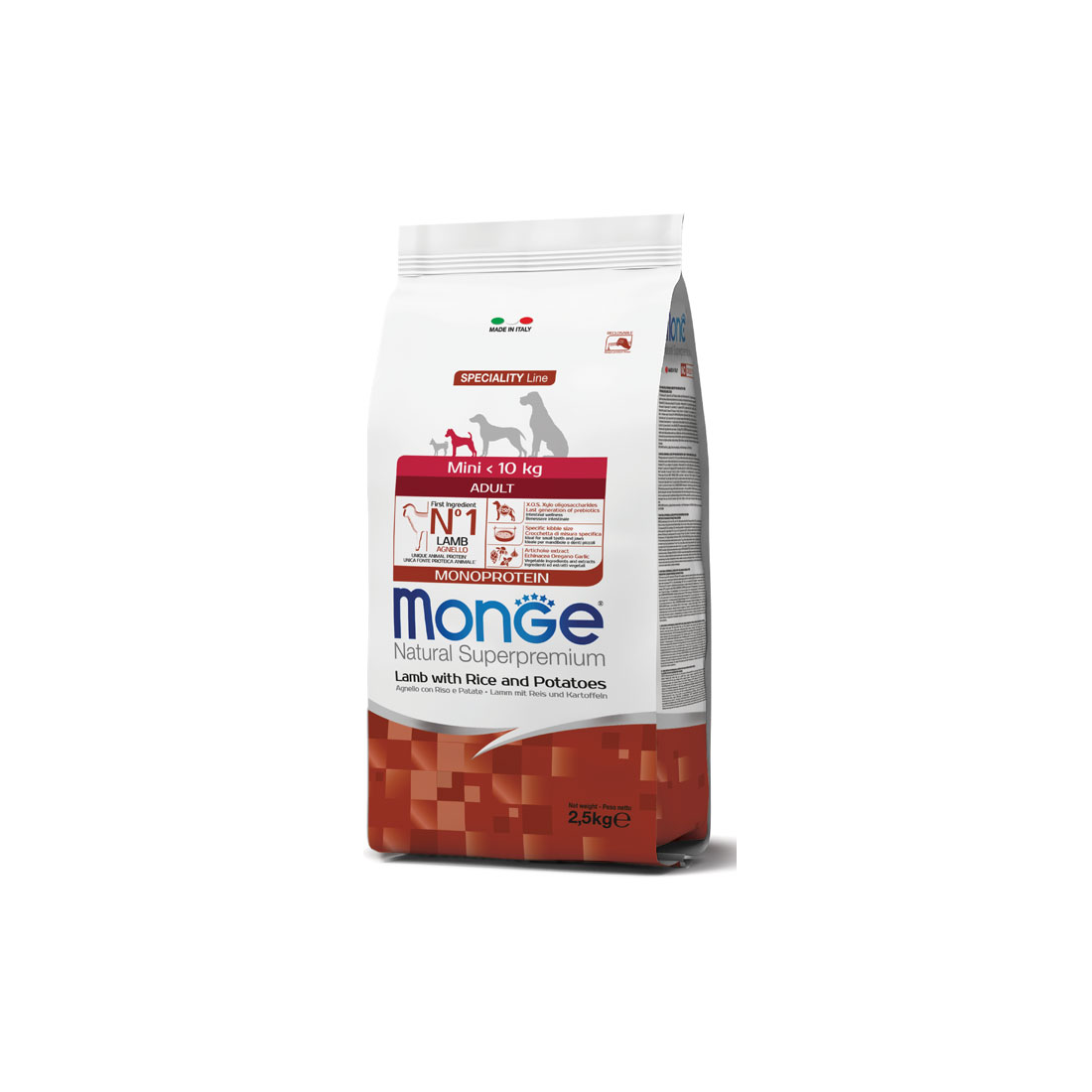 Monge Natural Superpremium Mini Adult Monoprotein* Agnello con riso e patate è un alimento completo per cani adulti di taglia mini.