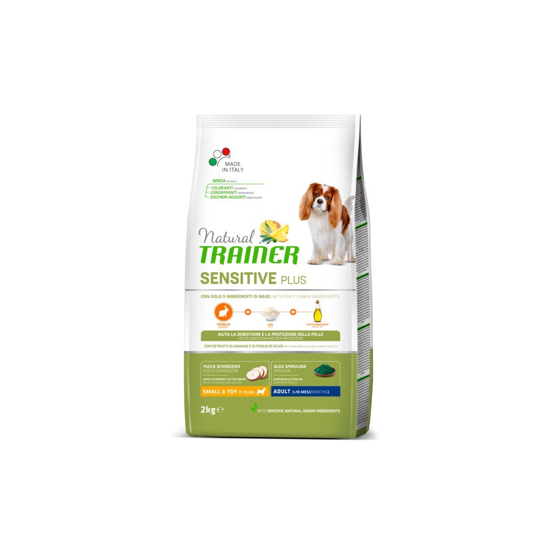 Natural Trainer Sensitive Adult Small & Toy è preparato secondo il "principio 1 + 1 + 1": contiene una sola proteina di origine animale (coniglio), una di carboidrati (riso) e una di grassi di origine vegetale (olio di mais). Componenti quali il riso e i prebiotici favoriscono la buona digestione, mentre l'estratto di foglie di olivo ha un effetto protettivo sulla cute. La composizione comprende inoltre spirulina, minerali e vitamine che contribuiscono alla vitalità del tuo cane. Natural Trainer Sensitive Plus Adult Small & Toy con coniglio è indicato come alimento completo da offrire quotidianamente al vostro cane.