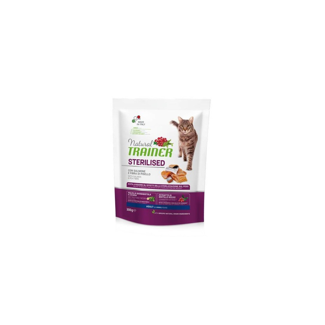 Trainer Natural Sterilised Cat Adult con Salmone e fibra di pisello - 300gr