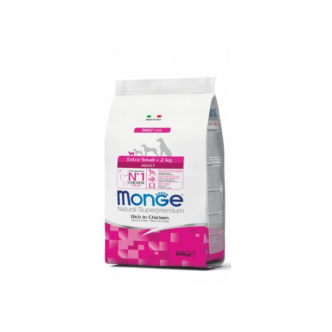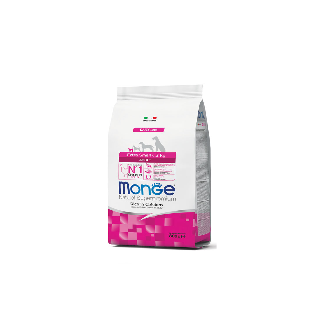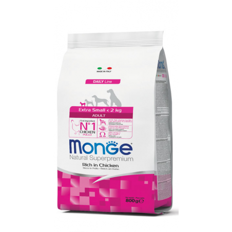 Monge Natural Superpremium Extra Small Adult Ricco in Pollo è un alimento completo per cani adulti di taglia extra small (<2 kg).