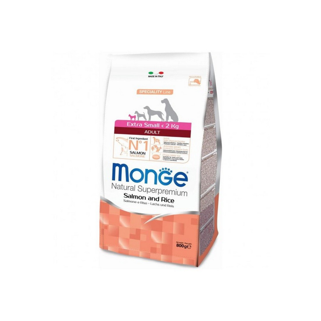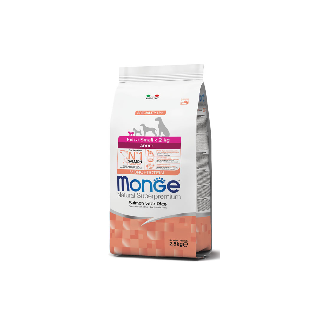 Monge Natural Superpremium Extra Small Adult Monoprotein* Salmone con Riso è un alimento completo per cani adulti di taglia extra small.