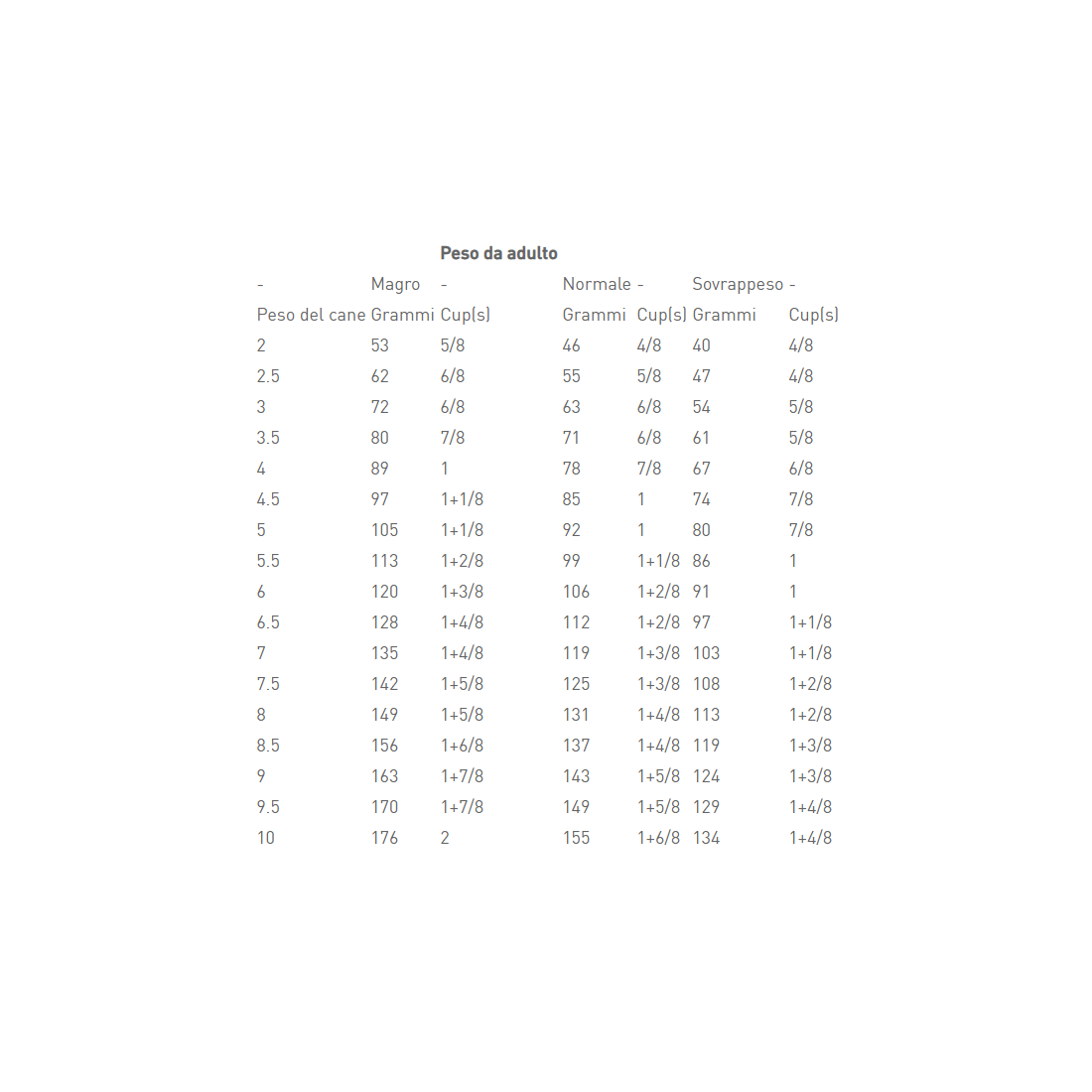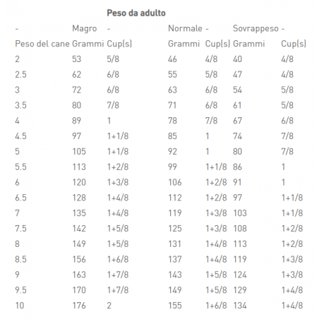 Peso da adulto-Magro-Normale-Sovrappeso-Peso del caneGrammiCup(s)GrammiCup(s)GrammiCup(s)2535/8464/8404/82.5626/8555/8474/83726/8636/8545/83.5807/8716/8615/84891787/8676/84.5971+1/8851747/851051+1/8921807/85.51131+2/8991+1/886161201+3/81061+2/89116.51281+4/81121+2/8971+1/871351+4/81191+3/81031+1/87.51421+5/81251+3/81081+2/881491+5/81311+4/81131+2/88.51561+6/81371+4/81191+3/891631+7/81431+5/81241+3/89.51701+7/81491+5/81291+4/81017621551+6/81341+4/8