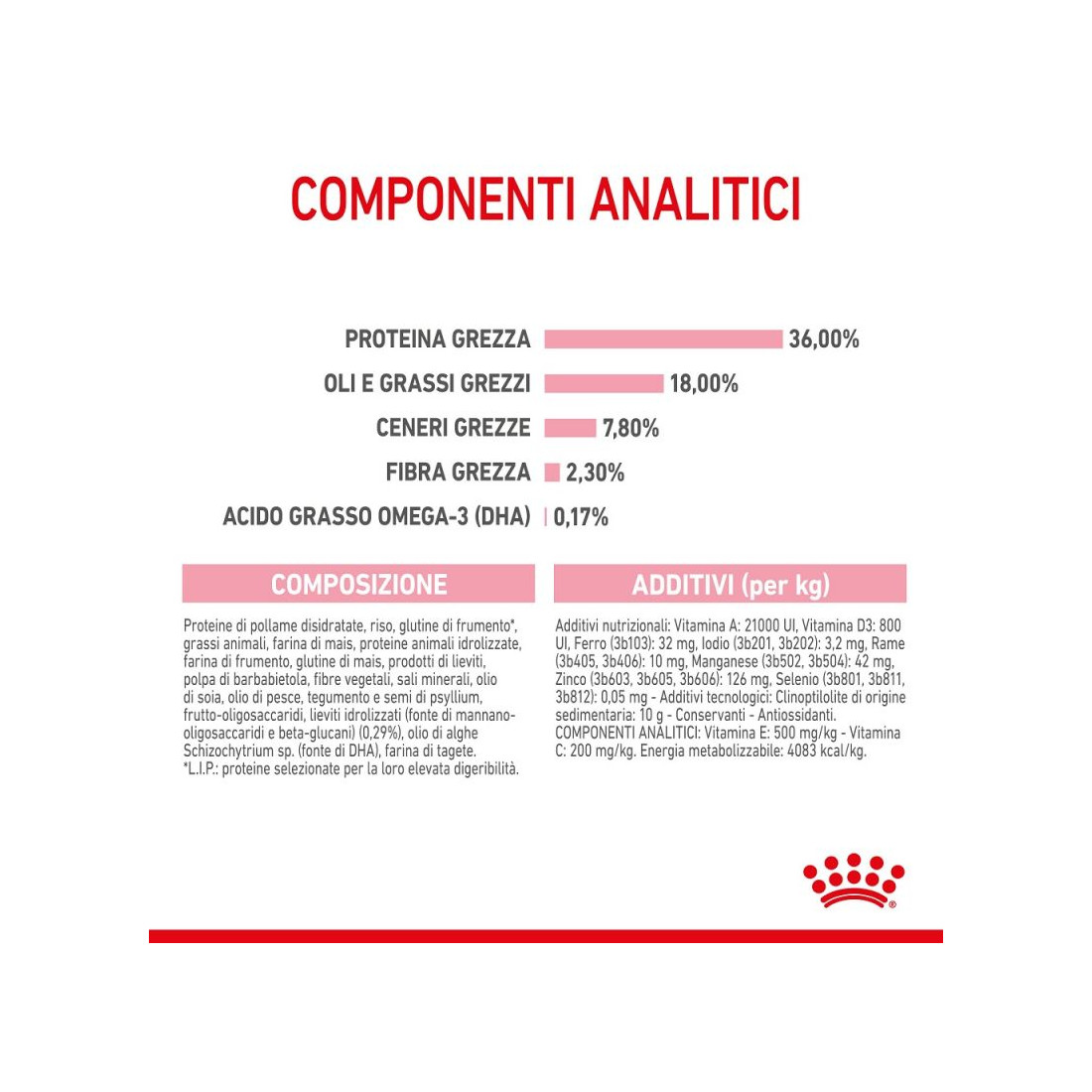 proteina di pollame disidratata, riso, glutine di frumento*, grasso animale, farina di amido di mais, proteine di pollame disidratate, farina di amido di frumento, glutine di mais, lieviti, polpa di barbabietola, fibre vegetali, minerali, olio di soia, olio di pesce, psillio (tegumento e semi), frutto-oligosaccaridi, idrolizzati di lieviti (fonte di mannano-oligosaccaridi e beta-glucani) 0,29%, olio di alghe Schizochytrium sp. (fonte di DHA), farina di fiori di tagete.