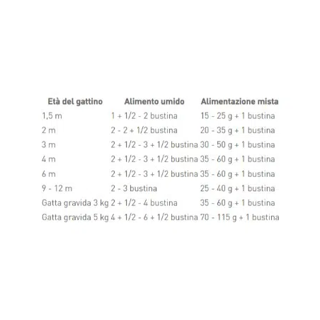 carni e derivati, cereali, estratti di proteine vegetali, sottoprodotti di origine vegetale, sali minerali, zuccheri, lieviti, oli e grassi. ADDITIVI (per kg): Additivi nutrizionali: Vitamina D3: 195 UI, E1 (Ferro): 2,8 mg, E2 (Iodio): 0,43 mg, E4 (Rame): 3,4 mg, E5 (Manganese): 0,8 mg, E6 (Zinco): 9 mg. COcarni e derivati, cereali, estratti di proteine vegetali, sottoprodotti di origine vegetale, sali minerali, zuccheri, lieviti, oli e grassi. ADDITIVI (per kg): Additivi nutrizionali: Vitamina D3: 195 UI, E1 (Ferro): 2,8 mg, E2 (Iodio): 0,43 mg, E4 (Rame): 3,4 mg, E5 (Manganese): 0,8 mg, E6 (Zinco): 9 mg. COMPONENTI ANALITICI: Proteina grezza: 12,3% - Oli e grassi grezzi: 4,3% - Ceneri grezze: 2% - Fibra grezza: 1% - Umidità: 78%.