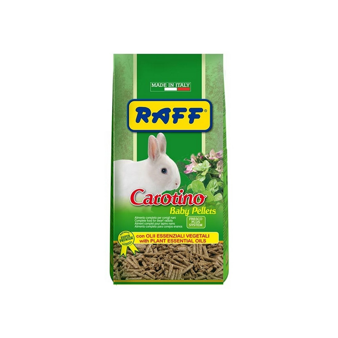 Raff Carotino Baby Pellet contiene un mix di olii essenziali, noti per le loro proprietà antisettiche, antibatteriche e antiparassitarie. È un mangime completo per coniglietti nani cuccioli e adulti integrato con robenidina, una sostanza con azione coccidiostatica. Quando in famiglia accogli un coniglietto nano giovane appena svezzato è consigliabile nutrirlo con una confezione di Carotino Baby Pellet come alimento base. Il coccidiostatico contenuto nel Carotino Baby Pellet svolge una azione di prevenzione e controllo della coccidiosi, tipica affezione che colpisce il coniglio soprattutto in tenera età.