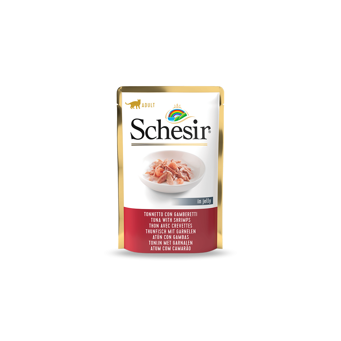 La ricetta Schesir è a base di veri filetti di delizioso tonnetto abbinati ai gamberetti un ingrediente delizioso. La preparazione è in gelatina, per soddisfare i gusti dei gatti che prediligono il sapore del mare, abbinato a una consistenza più compatta nella ciotola.