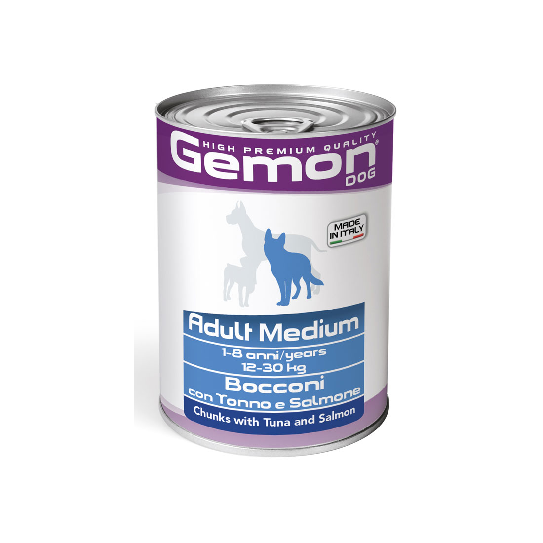 GEMON BOCCONI CON TONNO E SALMONE è un alimento completo per cani adulti di taglia media, formulato per fornire tutti i nutrienti necessari per la vitalità quotidiana dei nostri amici a quattro zampe.