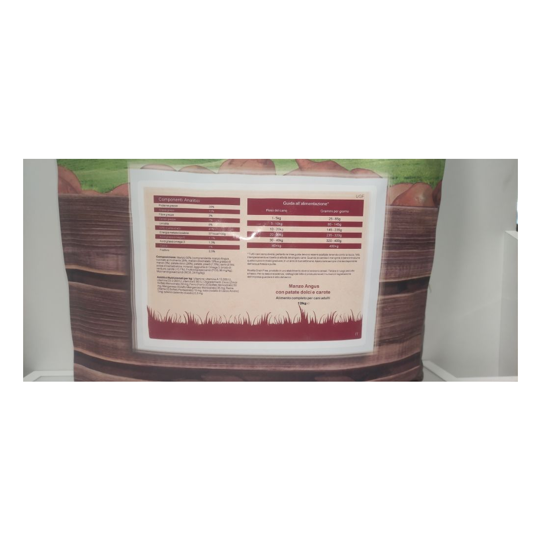 Manzo 50% (comprendente manzo Angus cucinato al momento 28%, manzo disidratato 19% e grasso di manzo 3%), patate dolci (26%), patate, piselli (7,5%), semi di lino, polpa di barbabietola, minerali, aggiunta di Omega 3, brodo di verdure, carote (<0,1%), Fruttooligosaccaridi (FOS, 96 mg/kg), Mannanoligosaccaridi (MOS, 24 mg/kg)
