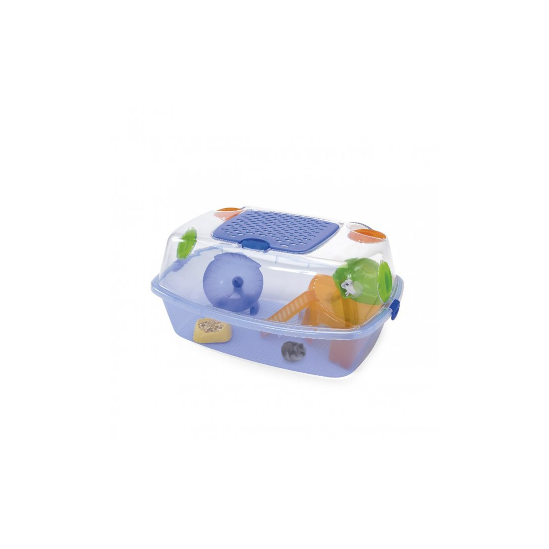 Costruita in solido materiale plastico, Yo-Yo Plus è una gabbia per criceti perfetta per insegnare ai vostri bimbi a prendersi cura del piccolo roditore divertendosi. Fondo e coperchio trasparenti ti permettono di avere una perfetta visibilità del tuo animaletto. Questa gabbia è un perfetto Habitat per il tuo criceto in quanto completa dei seguenti accessori: ciotola in plastica Mini Bowl, ripiano con scaletta Play House, ruota Rolly e nido Hut. Le comode clip laterali facilitano lo sgancio del tetto dal fondo per mantenere sempre pulita la gabbia. Sulla parte superiore del tetto un'ampia porta in plastica con fori, assicura una perfetta areazione e vi consentirà di raggiungere facilmente i vostri piccoli animali così come ogni angolo della gabbia. I due fori presenti sul tetto permettono di realizzare un percorso esterno con gli optional Kit Sphere e Sphere, per far divertire il vostro piccolo roditore e mantenerlo sempre in forma.