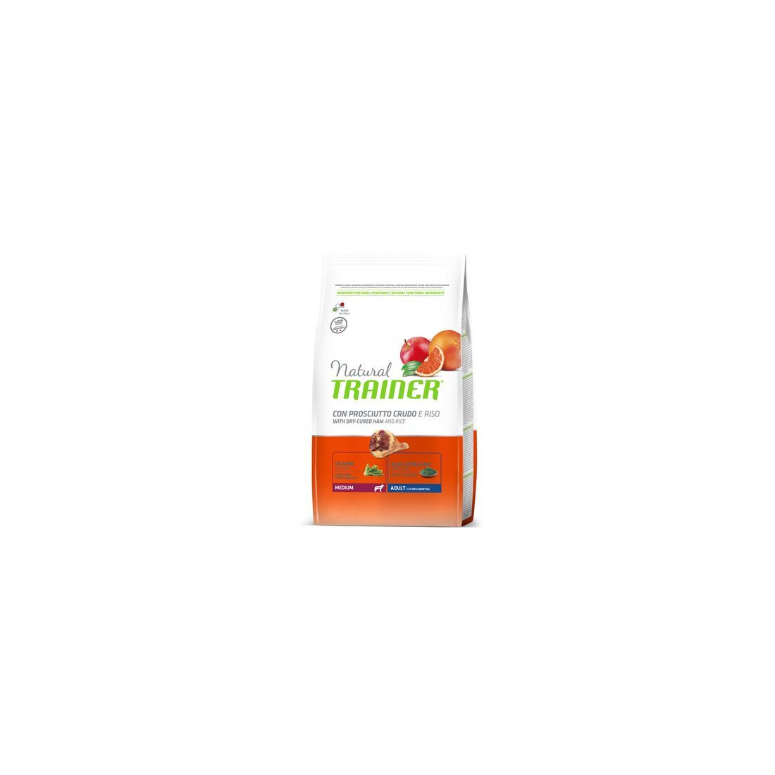 Trainer Natural Adult Medium con Prosciutto Crudo, Riso, Cicoria e Alga Spirulina è un alimento secco completo per cani adulti (più di un anno di età) e di taglia media (fino a 30 kg di peso). La componente proteica (carne di pollo, tacchino e prosciutto crudo) fornisce l’apporto calorico ed energetico ideale per il cane adulto di taglia media; il riso conferisce un’elevata digeribilità e rispetta le sensibilità digestive; la miscela di estratti e sostanze naturali (estratto di arancio amaro, fibre vegetali e pappa reale) favoriscono la salute di articolazioni, apparato digerente, pelle e mantello, denti e gengive. Gli ingredienti ricchi di sapore di Trainer Natural Adult Medium con Prosciutto Crudo, Riso, Cicoria e Alga Spirulina riconsegnano un complesso nutritivo sano, gustoso e di qualità adatto per il benessere generale del cane adulto di taglia media.