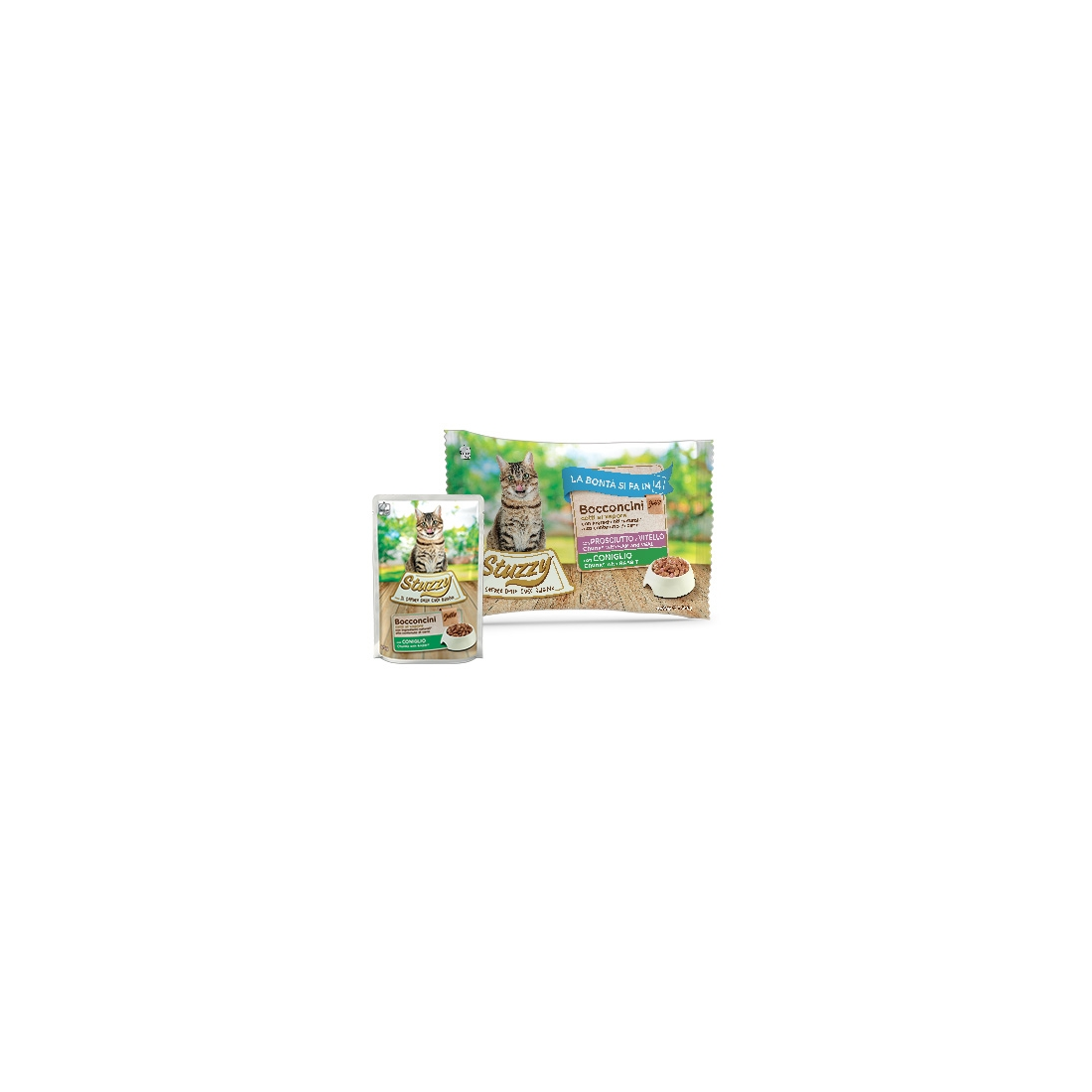 l tuo gatto non resiste alle ricette in gelatina? Questo multipack di Stuzzy fa per lui! I Bocconcini con Prosciutto e Vitello e i Bocconcini con Coniglio lo nutrono con tanto gusto, e con la genuinità degli ingredienti naturali, dell’alto contenuto di carni e della cottura al vapore. Sono alimenti completi, semplicemente irresistibili. Provali subito!