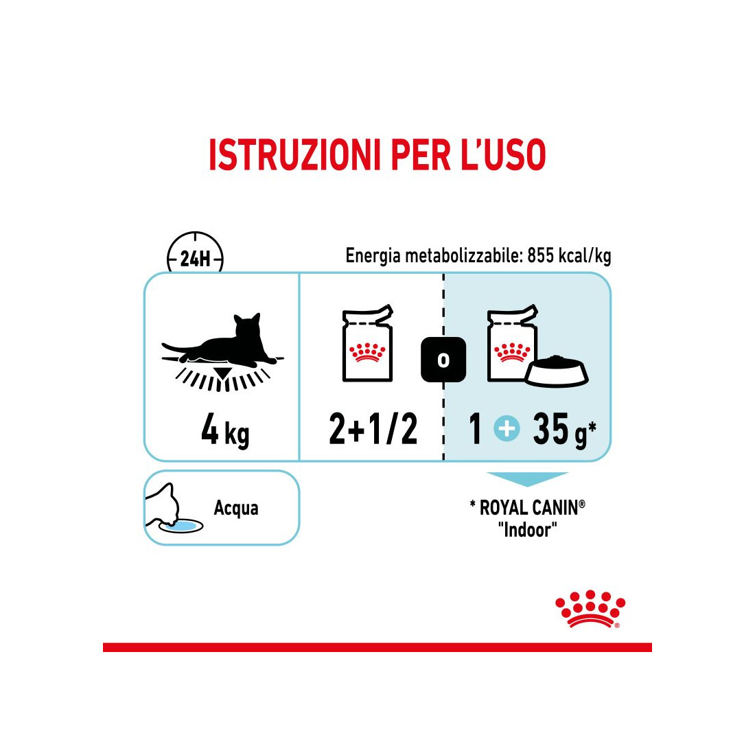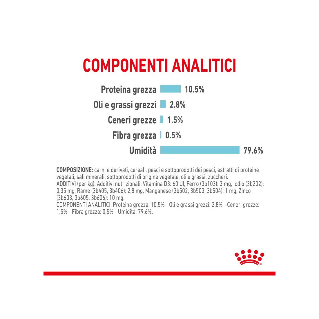 carni e derivati, cereali, pesci e sottoprodotti dei pesci, estratti di proteine vegetali, sali minerali, sottoprodotti di origine vegetale, oli e grassi, zuccheri. Additivi nutrizionali: Vitamina D3: 60 UI, Ferro (3b103): 3 mg, Iodio (3b202): 0,35 mg, Rame (3b405, 3b406): 2,8 mg, Manganese (3b502, 3b503, 3b504): 1 mg, Zinco (3b603, 3b605, 3b606): 10 mg. Proteina grezza: 10,5% - Oli e grassi grezzi: 2,8% - Ceneri grezze: 1,5% - Fibra grezza: 0,5% - Umidità: 79,6%.