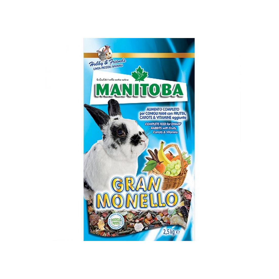 Il GranMonello Manitoba è un miscuglio di ricercato equilibrio nutrizionale , privo di cereali estrusi (amidi a rapida digestione mal tollerati dal coniglio), ricco in ortaggi (carote, fagiolini, piselli, fave) e frutta (carruba, banana, uva ed albicocca), integrato con vitamine, sali minerali e privo di coloranti.