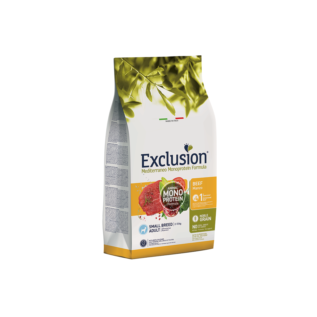 Exclusion Mediterraneo Monoprotein Formula – Noble Grain é un alimento completo e bilanciato formulato con una sola fonte proteica animale disidratata, per una ricetta chiara ed essenziale, e solo un cereale nobile di alta qualità. È preservato con antiossidanti naturali e integrato con Beta-glucani. È realizzato con una innovativa ricetta di Superfood della tradizione Mediterranea: Canapa, Olio d’Oliva, Pomodoro, Melagrana, Broccolo e Cicoria. Senza grasso di pollo, frumento, soia e mais aggiunti.