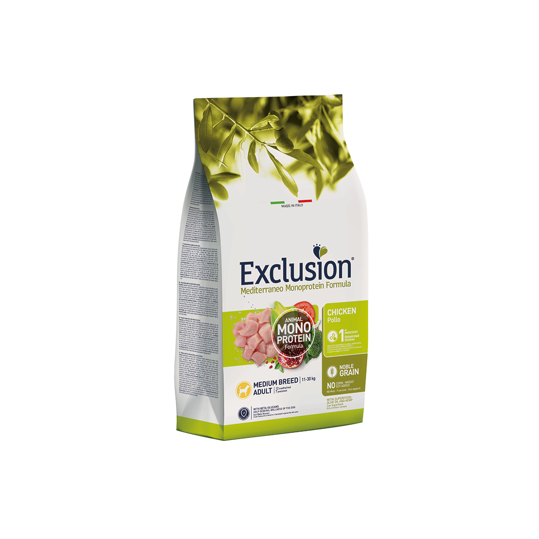 Exclusion Mediterraneo Monoprotein Formula – Noble Grain é un alimento completo e bilanciato formulato con una sola fonte proteica animale disidratata, per una ricetta chiara ed essenziale, e solo un cereale nobile di alta qualità. È preservato con antiossidanti naturali e integrato con Beta-glucani. È realizzato con una innovativa ricetta di Superfood della tradizione Mediterranea: Canapa, Olio d’Oliva, Pomodoro, Melagrana, Broccolo e Cicoria. Senza grasso di pollo, frumento, soia e mais aggiunti.