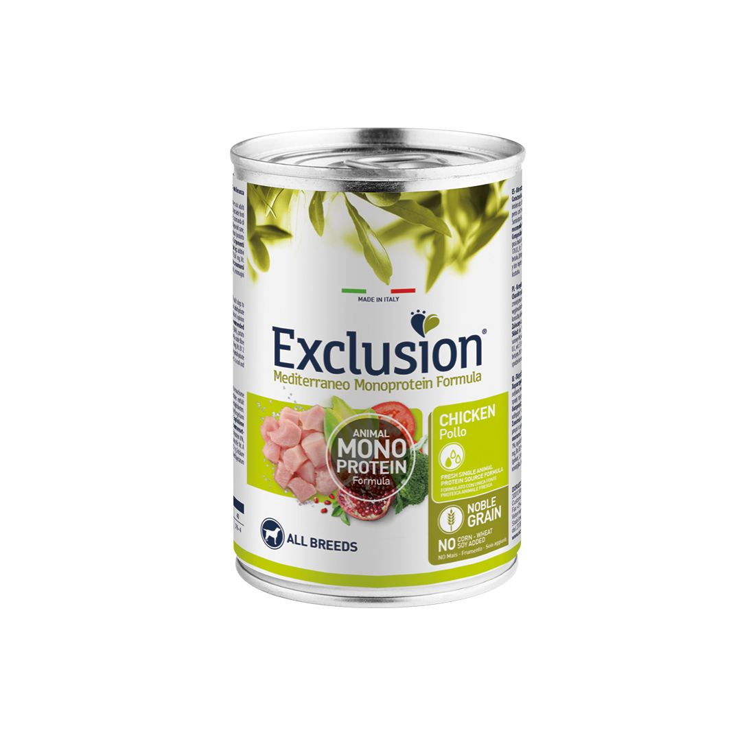 Exclusion Mediterraneo Monoprotein Formula – Noble Grain é un alimento completo e bilanciato formulato con una sola fonte proteica animale disidratata, per una ricetta chiara ed essenziale, e solo un cereale nobile di alta qualità. È preservato con antiossidanti naturali e integrato con Beta-glucani. È realizzato con una innovativa ricetta di Superfood della tradizione Mediterranea: Canapa, Olio d’Oliva, Pomodoro, Melagrana, Broccolo e Cicoria. Senza grasso di pollo, frumento, soia e mais aggiunti.