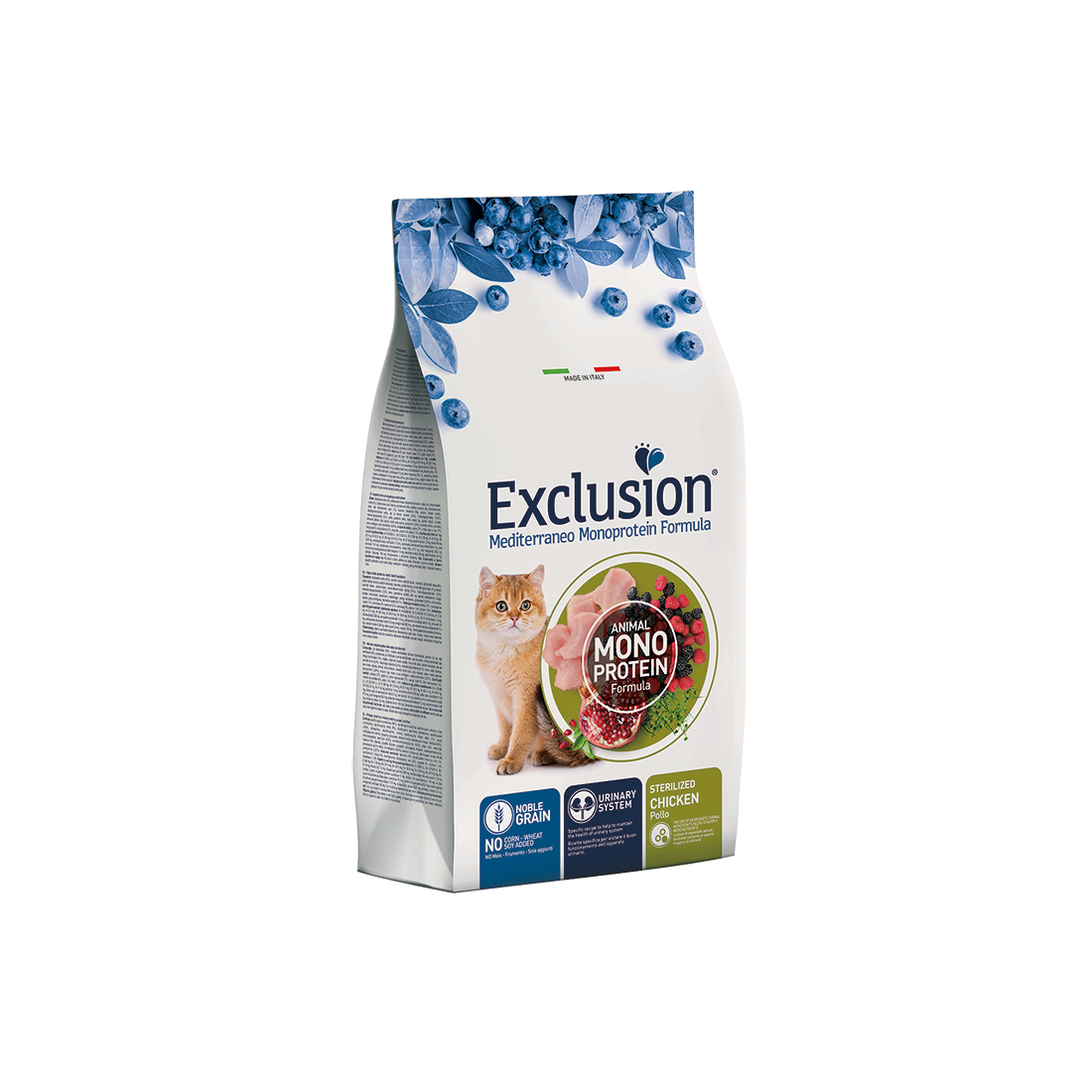Exclusion Mediterraneo Monoprotein Formula – Noble Grain é un alimento completo e bilanciato, formulato con una sola fonte proteica animale disidratata, per una ricetta chiara ed essenziale, e con solo un cereale nobile di alta qualità. La specifica formulazione aiuta il buon funzionamento delle vie urinarie ed è preservato con antiossidanti naturali. È realizzato con una innovativa ricetta con Superfood della tradizione Mediterranea: melagrana, more, lamponi e mirtilli neri. È arricchito con Psyllium per aiutare a contrastare la formazione dei boli di pelo. Senza grasso di pollo, frumento, soia e mais aggiunti.