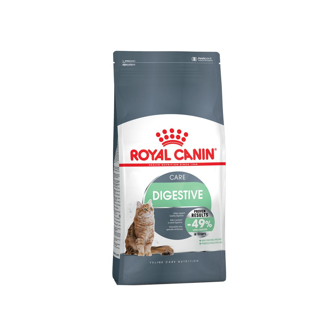 Royal Canin Digestive Care è un alimento completo e bilanciato gatti adulti, specifico per favorire una buona digestione. Le crocchette sono preparate con proteine altamente digeribili e presentano una miscela di prebiotici e fibre nutrizionali che regolano la digestione e favoriscono l'equilibrio della flora intestinale.